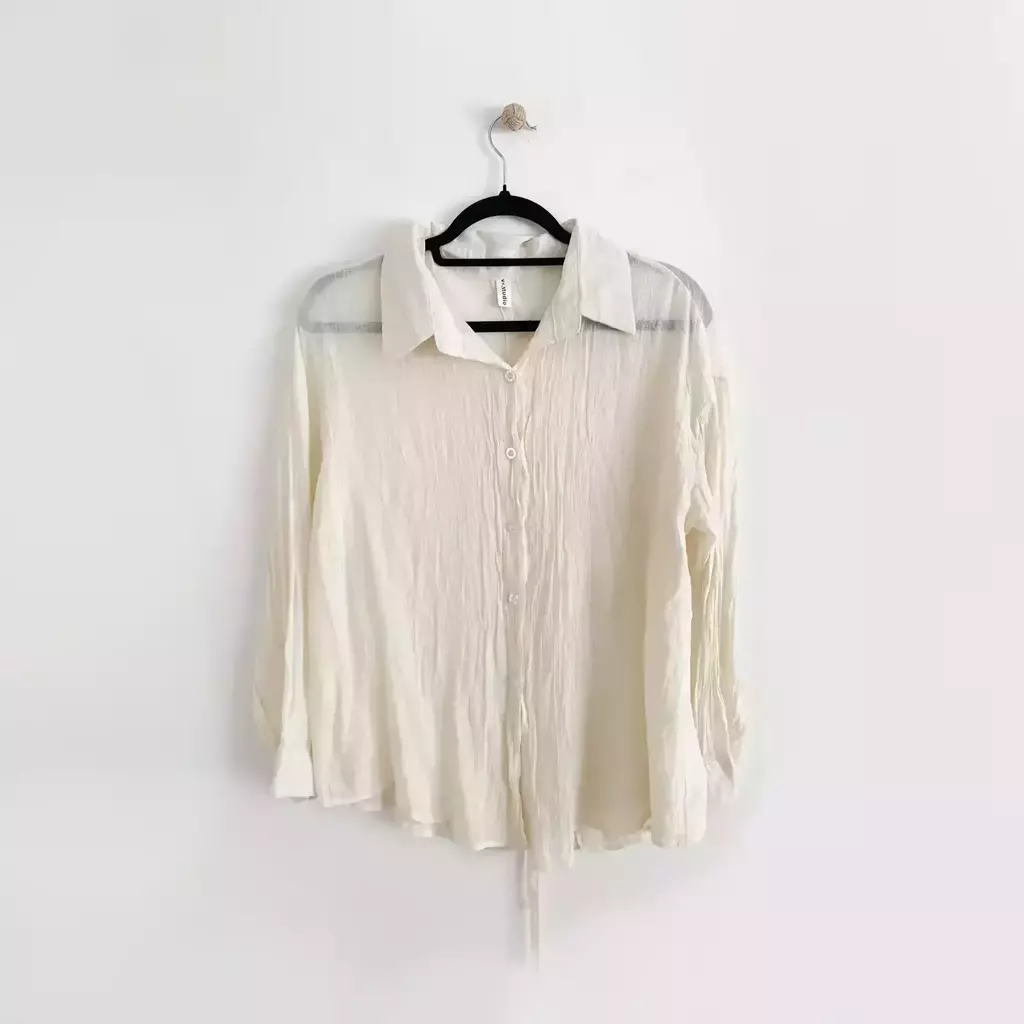 Camisa color hueso satinado con espalda abierta, ideal look de playa, fresca y etérea. Diseño con botones y nudo en espalda. Detalle de sutiles marcas en frente (última foto), oportunidad.