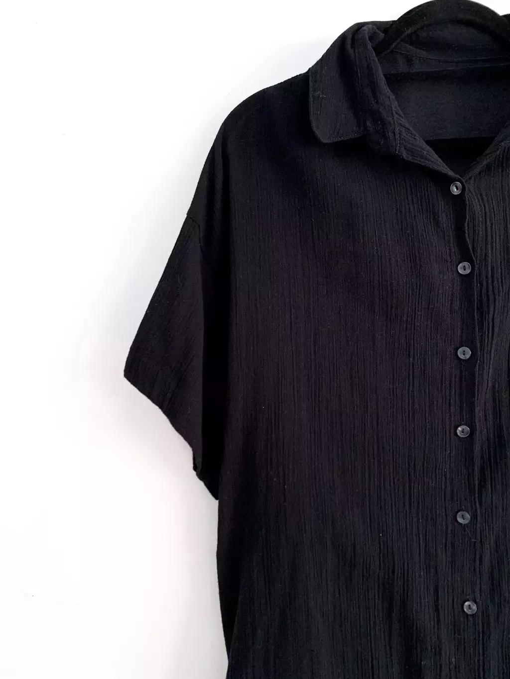 Camisa larga negra, un básico relajado que hace al look. Etérea y fresca.