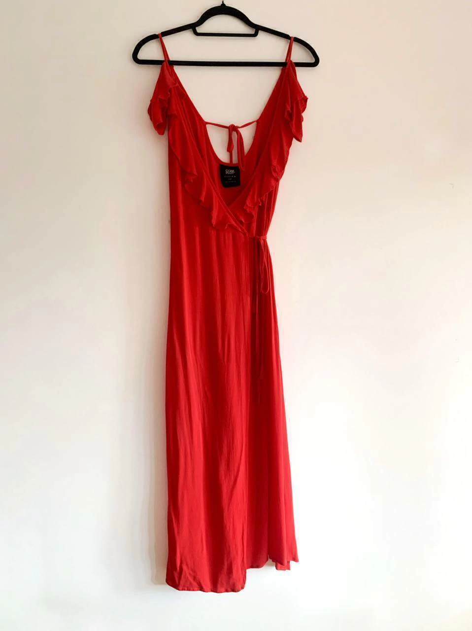 Vestido de gasa tipo crepe de COMPLOT. Rojo fuerte, se cruza con lazo y se adapta fácilmente a distintos cuerpos y talles (del small al medium/large). Un vestido para evento arreglado, largo. Detalle de volados que caen sobre los hombros.